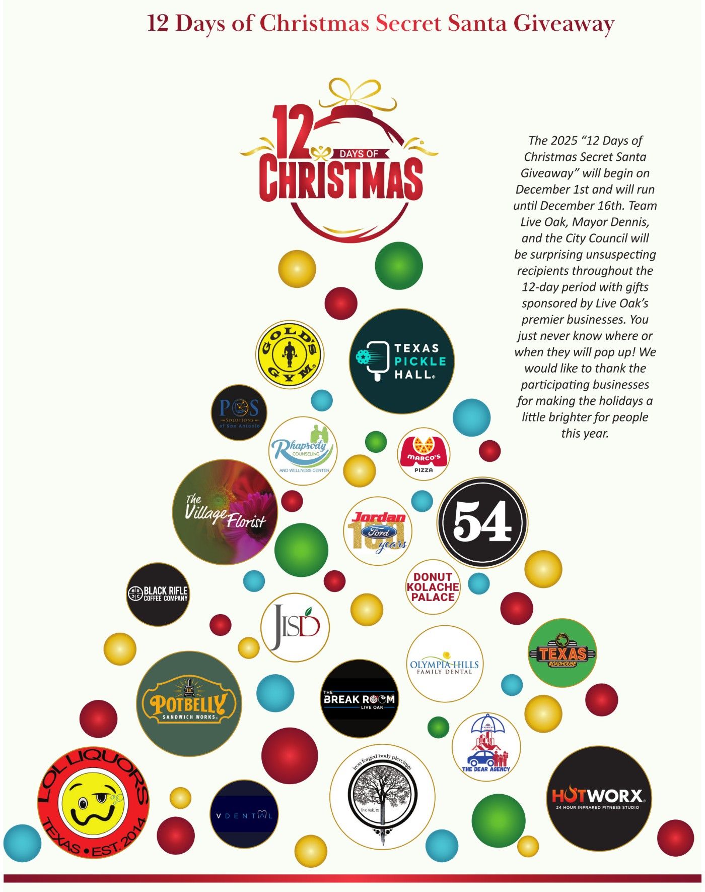 Team Live Oak, Mayor Dennis, and the City Council will be surprising unsuspecting recipients throughout the 12-day period with gifts sponsored by Live Oak's premier businesses. You just never know where or when they will pop up! We would like to thank the participating businesses for making the holidays a little brighter for people this year.